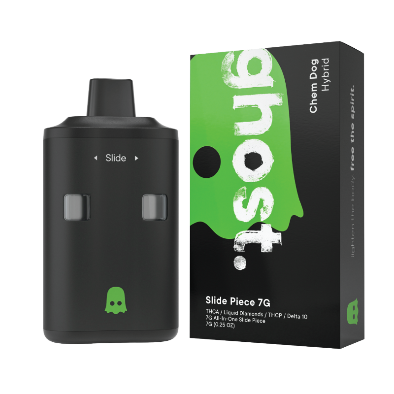The Chem Dog is part of the Slide Piece 7g collection, which features premium Hemp-Derived THC. These all-in-one disposable devices contain 7 grams of a potent blend of cannabinoids and natural terpenes.